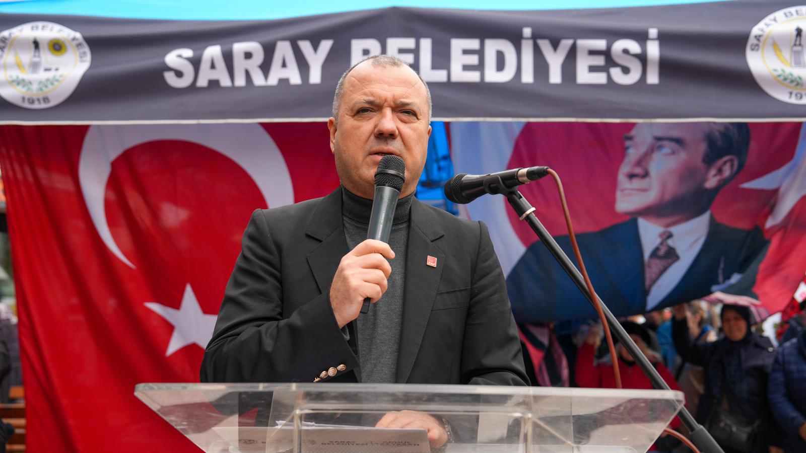 Biz biliyoruz ki; kentler meydanlarıyla, meydanlar ise simgeleriyle anılır. İşte bugün açılışını gerçekleştirdiğimiz bu Saat Kulesi, ilçemizin siluetine yeni bir soluk getirecek. Gelecek nesillere miras bırakacağımız bu eser, Saray’ın köklü geçmişiyle aydınlık geleceği arasında bir köprü vazifesi görecek.