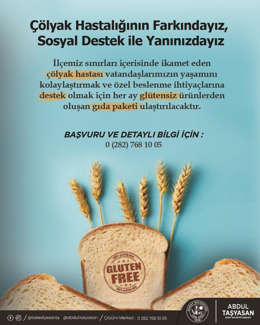 Saray Belediye Başkanı Abdül Taşyasan proje ile ilgili yaptığı açıklamada, “Çölyak, hastalar için uzun soluklu ve yorucu bir süreç. Bu sürecin sürdürülebilirliği ciddi bir maliyet gerektiriyor. Piyasada zor bulunan ve yüksek fiyatlara satılan glütensiz ürünlerden oluşan gıdaların yer aldığı paketlerimiz ile vatandaşlarımıza destek olmayı hedefliyoruz. Dayanışmayı yaşamın her alanına yaymak istediğimiz projeler ile bundan sonra da vatandaşlarımızın yanında olmaya devam edeceğiz” dedi.
